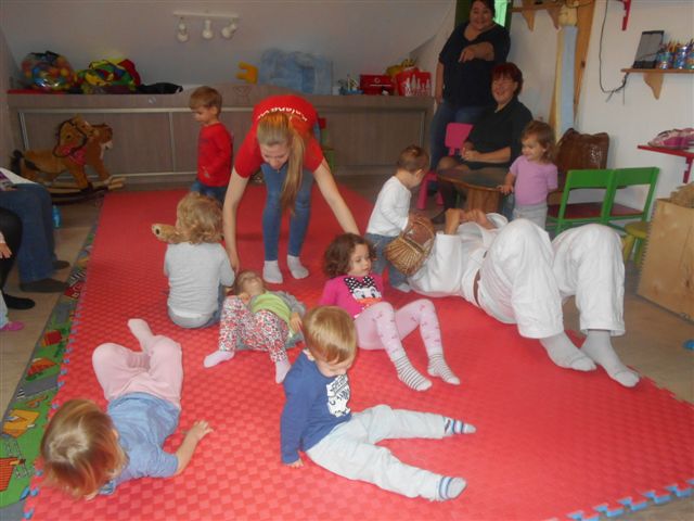 Olivér bemutatta bölcsis judo-foglalkozását: hogyan tanulnak mosolyvári Apróságaink biztonságosan esni, buksit-védeni.... rövid megfigyelés után vendég-babáink is becsatlakoztak. :)